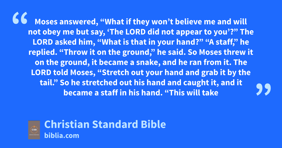 3 “Throw it on the ground,” he said. So Moses threw it on the ground, it became a snake, and he ran from it. 4 The Lord told Moses, “Stretch out your hand and grab it by the tail.” So he stretched out his hand and caught it, and it became a staff in his hand. 5 “This will take place,” he continued, “so that they will believe that the Lord, the God of their ancestors, the God of Abraham, the God of Isaac, and the God of Jacob, has appeared to you.”h