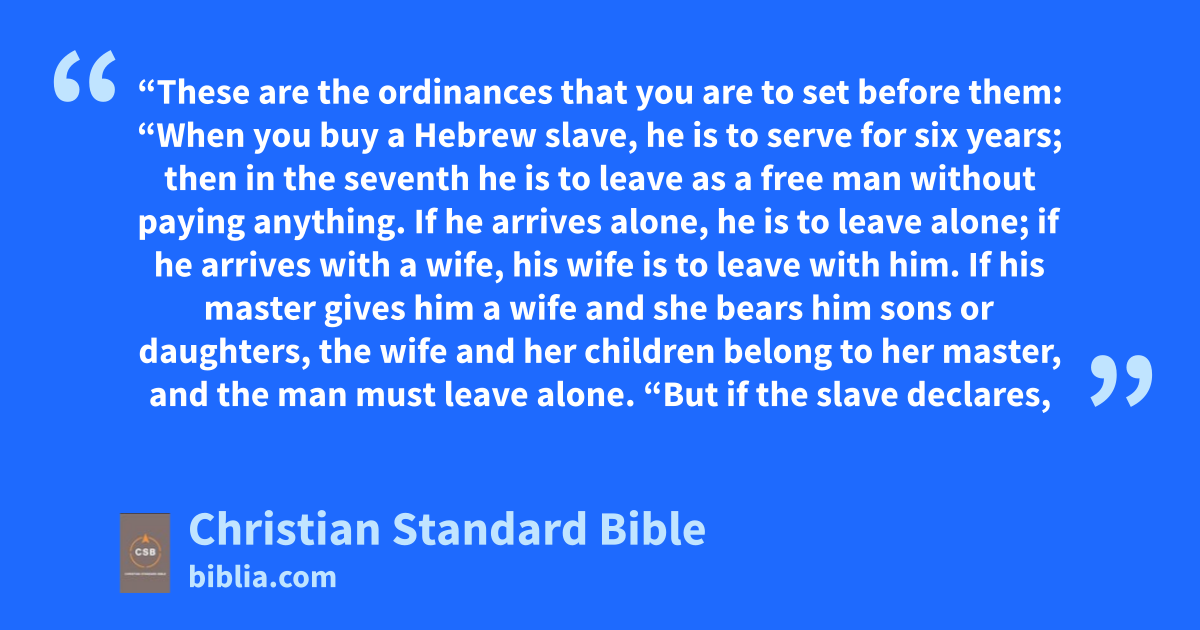 2 “When you buy a Hebrew slave, he is to serve for six years; then in the seventh he is to leave as a free manD without paying anything.a 3 If he arrives alone, he is to leave alone; if he arrives withE a wife, his wife is to leave with him. 4 If his master gives him a wife and she bears him sons or daughters, the wife and her children belong to her master, and the man must leave alone.