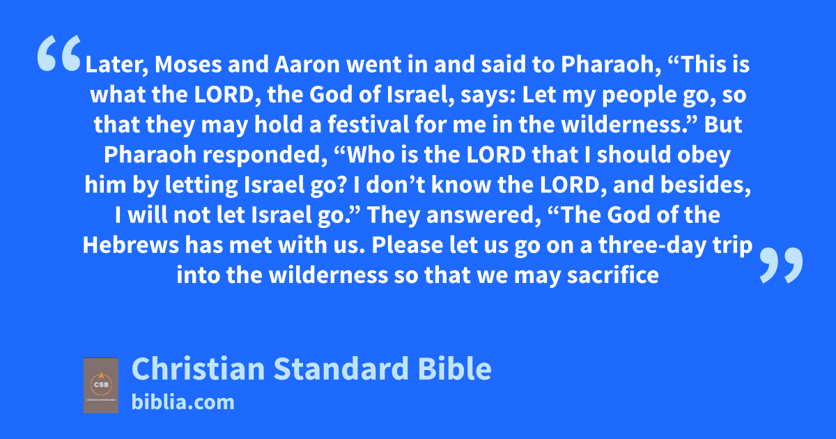 5 Later, Moses and Aaron went in and said to Pharaoh, “This is what the Lord, the God of Israel, says: Let my people go, so that they may hold a festival for me in the wilderness.”e