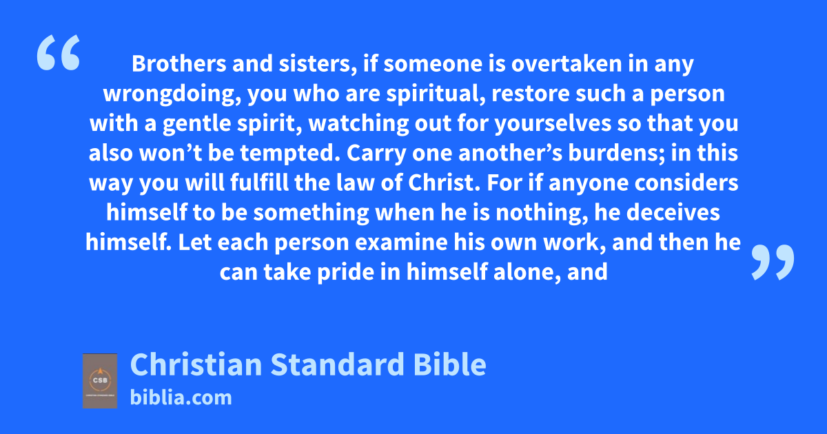 6 Brothers and sisters, if someone is overtaken in any wrongdoing, you who are spiritual, restore such a person with a gentleba spirit,G,bb watching out for yourselves so that you also won’t be tempted.bc 2 Carry one another’s burdens; in this way you will fulfill the law of Christ.bd 3 For if anyone considers himself to be something when he is nothing,be he deceives himself. 4 Let each person examine his own work,bf and then he can take pride in himself alone, and not compare himself with someone else. 5 For each person will have to carry his own load.