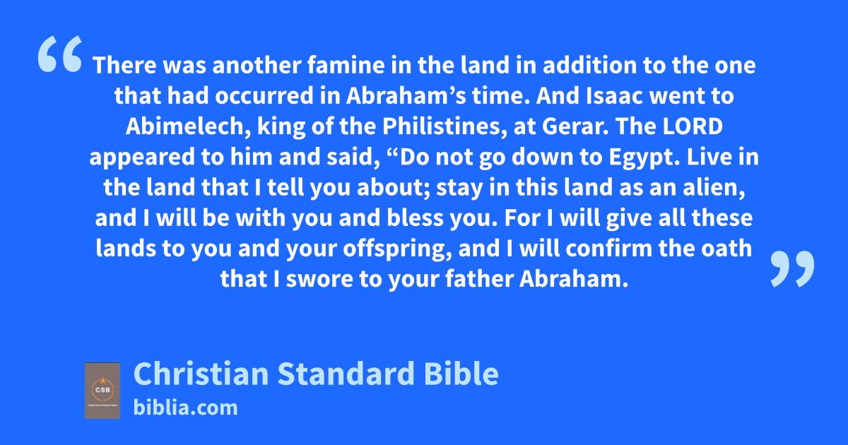 26 There was another famine in the land in addition to the one that had occurred in Abraham’s time.aa And Isaac went to Abimelech, king of the Philistines, at Gerar.ab 2 The Lord appeared to him and said, “Do not go down to Egypt. Live in the land that I tell you about; 3 stay in this land as an alien, and I will be with you and bless you.a For I will give all these lands to you and your offspring,b and I will confirm the oath that I swore to your father Abraham.c 4 I will make your offspring as numerous as the stars of the sky, I will give your offspring all these lands, and all the nations of the earth will be blessedA by your offspring,d 5 because Abraham listened to me and kept my mandate, my commands, my statutes, and my instructions.”e 6 So Isaac settled in Gerar.