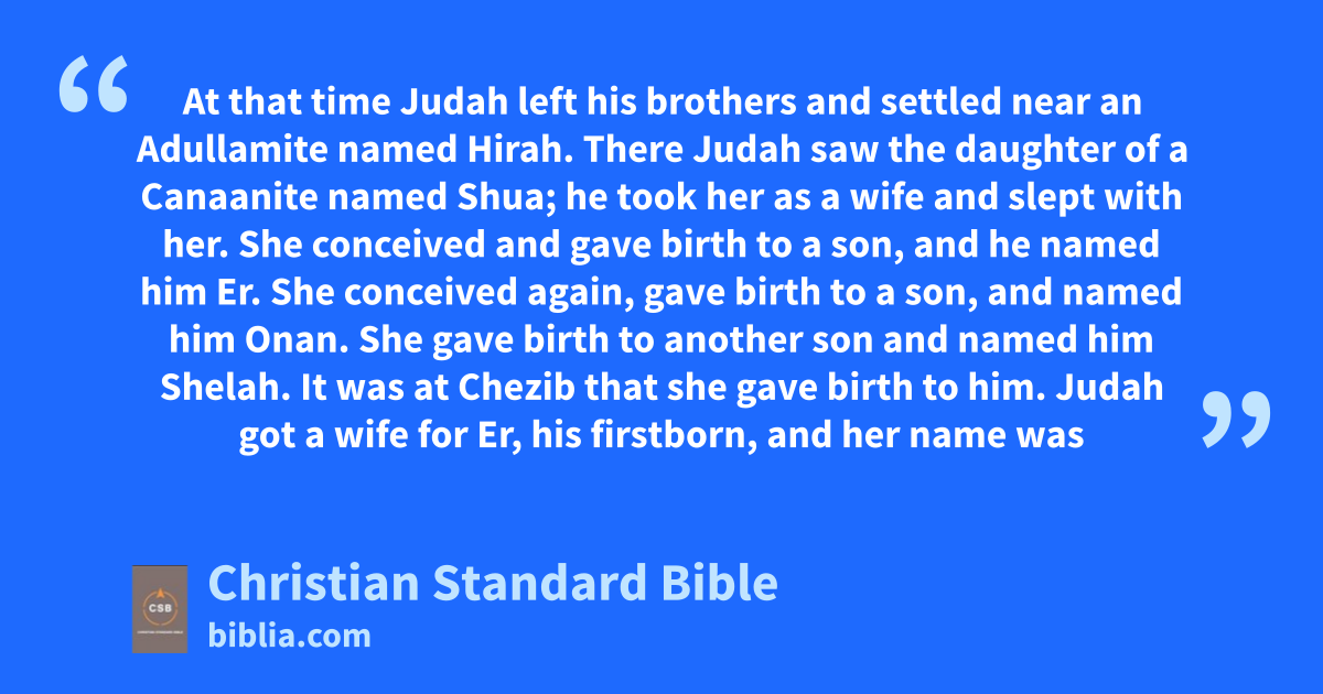 38 At that time Judah left his brothers and settled near an Adullamiteo named Hirah. 2 There Judah saw the daughter of a Canaanite named Shua; he took her as a wife and slept with her. 3 She conceived and gave birth to a son, and he named him Er.p 4 She conceived again, gave birth to a son, and named him Onan. 5 She gave birth to another son and named him Shelah. It was at Chezib thatB,C she gave birth to him.