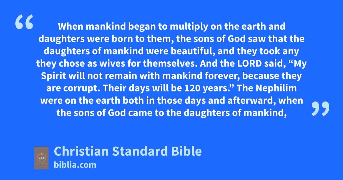 6 When mankind began to multiply on the earth and daughters were born to them, 2 the sons of Goda saw that the daughters of mankind were beautiful, and they took any they chose as wives for themselves. 3 And the Lord said, “My Spirit will not remainA withB mankind forever,c because they are corrupt.C,d Their days will be 120 years.” 4 The Nephilim* were on the earth both in those days and afterward, when the sons of God came to the daughters of mankind, who bore children to them. They were the powerful men of old, the famous men.