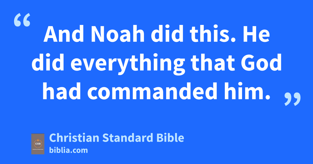 17 “Understand that I am bringing a flood—floodwaters on the earthm to destroy every creature under heaven with the breath of life in it. Everything on earth will perish. 18 But I will establish my covenant with you,n and you will enter the ark with your sons, your wife, and your sons’ wives. 19 You are also to bring into the ark two of all the living creatures, male and female, to keep them alive with you. 20 Two of everything—from the birds according to their kinds, from the livestock according to their kinds, and from the animals that crawl on the ground according to their kinds—will come to you so that you can keep them alive. 21 Take with you every kind of food that is eaten; gather it as food for you and for them.” 22 And Noah did this. He did everything that God had commanded him.o