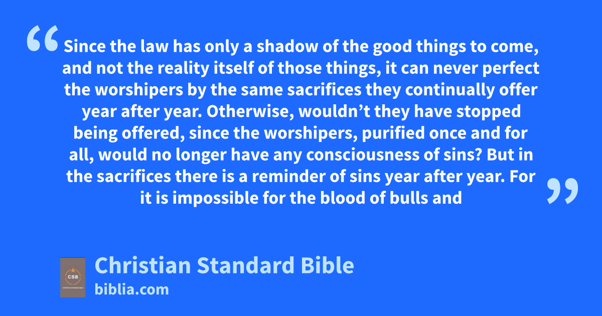 10 Since the law has only a shadow of the good thingsac to come, and not the reality itself of those things, it can never perfect the worshipers by the same sacrifices they continually offer year after year. 2 Otherwise, wouldn’t they have stopped being offered, since the worshipers, purified once and for all, would no longer have any consciousness of sins? 3 But in the sacrifices there is a reminder of sins year after year. 4 For it is impossible for the blood of bulls and goats to take away sins.