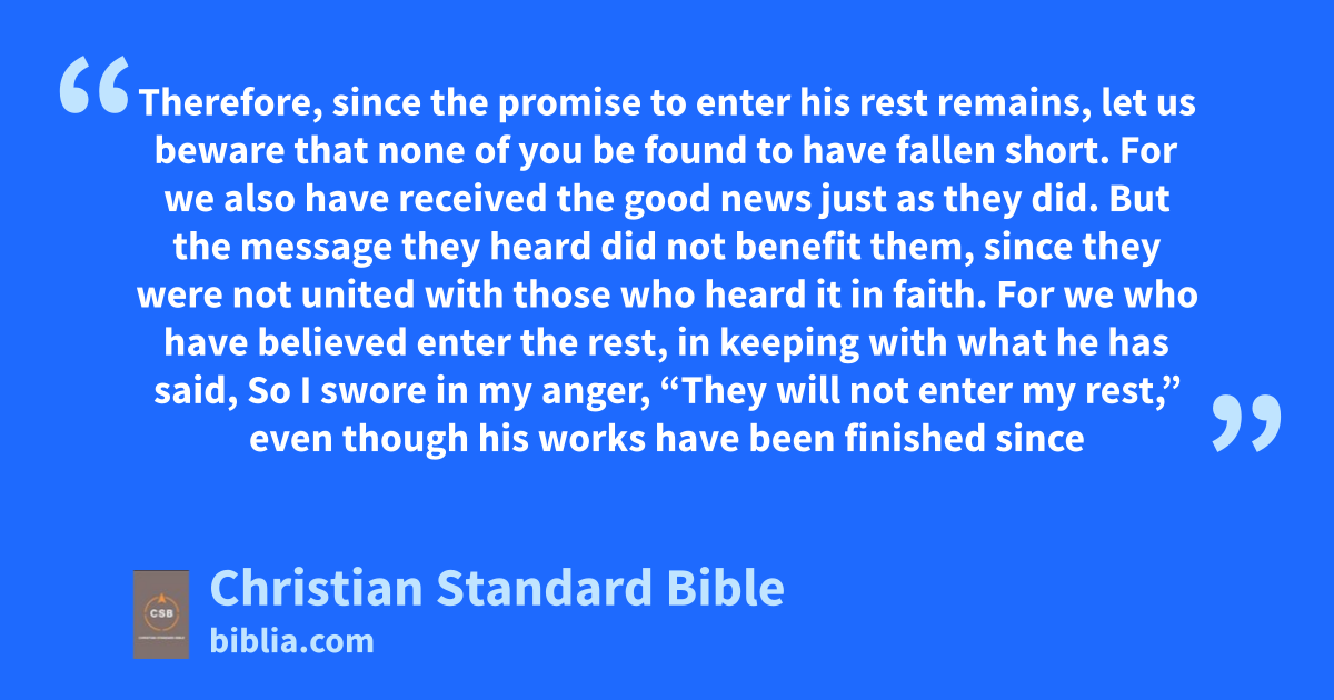 4 Therefore, since the promise to enter his rest remains, let us bewareE that none of you be found to have fallen short.F 2 For we also have received the good news just as they did. But the message they heard did not benefit them, since they were not united with those who heard it in faith.G,aa 3 For we who have believed enter the rest, in keeping with whatH he has said,