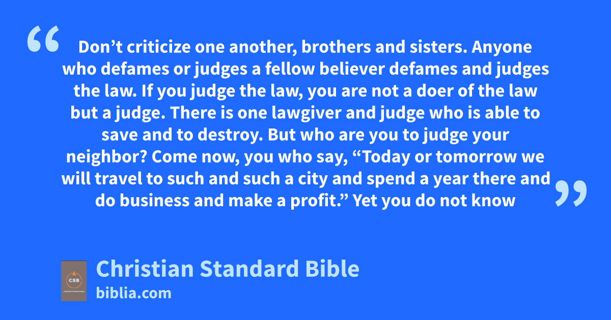 11 Don’t criticize one another, brothers and sisters. Anyone who defames or judges a fellow believerE defames and judges the law. If you judge the law, you are not a doer of the law but a judge.k 12 There is one lawgiver and judgeF who is able to save and to destroy. But who are you to judge your neighbor?l