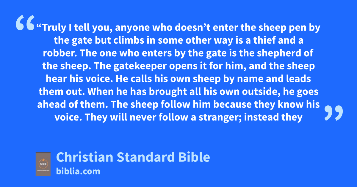 10 “Truly I tell you, anyone who doesn’t enter the sheep pen by the gate but climbs in some other way is a thief and a robber.aa 2 The one who enters by the gate is the shepherdab of the sheep.ac 3 The gatekeeper opens it for him, and the sheep hear his voice. He calls his own sheep by name and leads them out. 4 When he has brought all his own outside, he goes ahead of them. The sheep follow him because they know his voice. 5 They will never follow a stranger; instead they will run away from him, because they don’t know the voice of strangers.” 6 Jesus gave them this figure of speech, but they did not understandad what he was telling them.