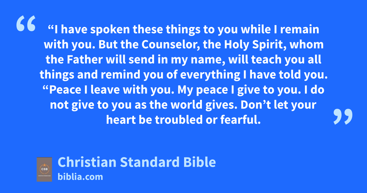 27 “Peace I leave with you. My peace I give to you. I do not give to you as the world gives. Don’t let your heart be troubled or fearful.al 28 You have heard me tell you, ‘I am going awayam and I am coming to you.’ If you loved me, you would rejoice that I am going to the Father,an because the Father is greater than I.ao 29 I have told you now before it happensap so that when it does happen you may believe. 30 I will not talk with you much longer, because the ruler of the worldaq is coming. He has no power over me.A,ar 31 On the contrary, so that the world may know that I love the Father, I do as the Father commanded me.