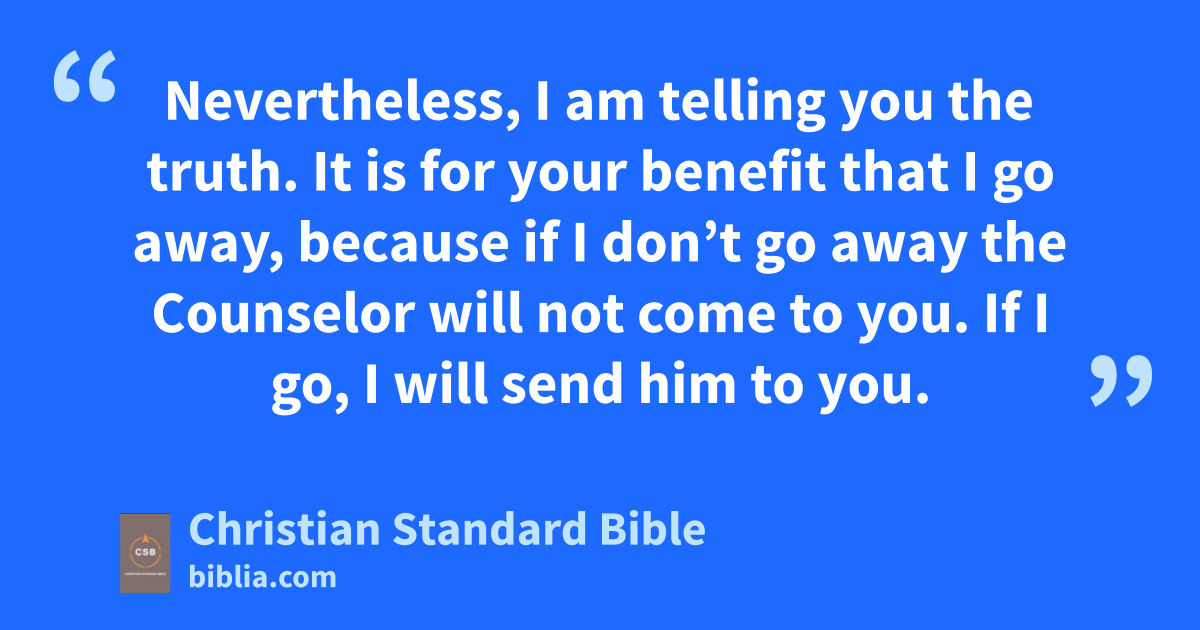 16 “I have told you these things to keep you from stumbling. 2 They will ban you from the synagogues.ad In fact, a time is coming when anyone who kills you will think he is offering serviceae to God. 3 They will do these things because they haven’t knownaf the Father or me. 4 But I have told you these things so that when their timeB comes you will rememberag I told them to you. I didn’t tell you these things from the beginning, because I was with you. 5 But now I am going awayah to him who sent me, and not one of you asks me, ‘Where are you going?’ai 6 Yet, because I have spoken these things to you, sorrow has filled your heart. 7 Nevertheless, I am telling you the truth.aj It is for your benefit that I go away, because if I don’t go away the Counselor will not come to you. If I go, I will send him to you.ak 8 When he comes, he will convict the world about sin, righteousness, and judgment: 9 About sin, because they do not believe in me; 10 about righteousness, because I am going to the Fatheral and you will no longer see me; 11 and about judgment,am because the ruler of this worldan has been judged.ao