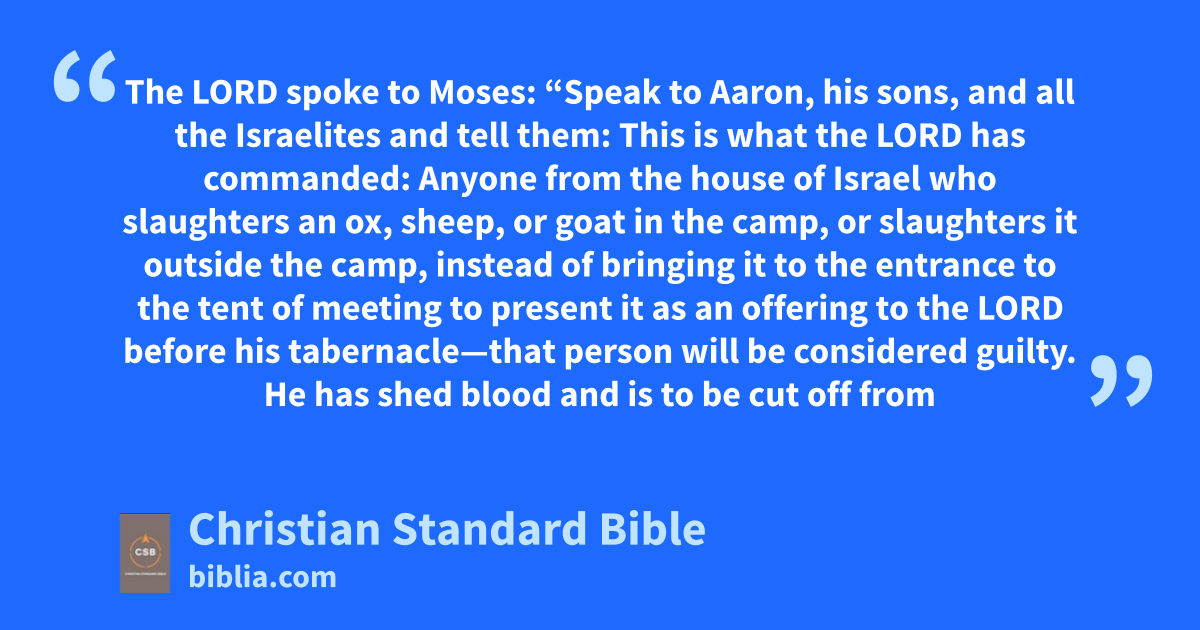 17 The Lord spoke to Moses: 2 “Speak to Aaron, his sons, and all the Israelites and tell them: This is what the Lord has commanded: 3 Anyone from the house of Israel who slaughtersa an ox, sheep, or goat in the camp, or slaughters it outside the camp, 4 instead of bringing it to the entrance to the tent of meeting to present it as an offering to the Lord before his tabernacle—that person will be considered guilty.B,b He has shed bloodc and is to be cut off from his people.d 5 This is so the Israelites will bring to the Lord the sacrificese they have been offering in the open country. They are to bring them to the priest at the entrance to the tent of meeting and offer them as fellowship sacrificesf to the Lord. 6 The priest will then splatter the blood on the Lord’s altar at the entrance to the tent of meeting and burn the fat as a pleasing aroma to the Lord. 7 They must no longer offer their sacrifices to the goat-demonsg that they have prostitutedh themselves with. This will be a permanent statutei for them throughout their generations.