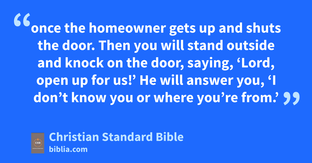 He said to them, 24 “Make every effort to enter through the narrow door,e because I tell you, many will try to enter and won’t be able 25 once the homeowner gets up and shuts the door.f Then you will stand outside and knock on the door, saying, ‘Lord, open up for us!’ He will answer you, ‘I don’t know you or where you’re from.’ 26 Then you will say, ‘We ate and drank in your presence, and you taught in our streets.’ 27 But he will say, ‘I tell you, I don’t know you or where you’re from. Get away from me,g all you evildoers!’ 28 There will be weeping and gnashing of teethh in that place,i when you see Abraham, Isaac, Jacob, and all the prophets in the kingdom of God,j but yourselves thrown out. 29 They will come from east and west, from north and south, to share the banquetD in the kingdom of God. 30 Note this: Some who are last will be first, and some who are first will be last.”k