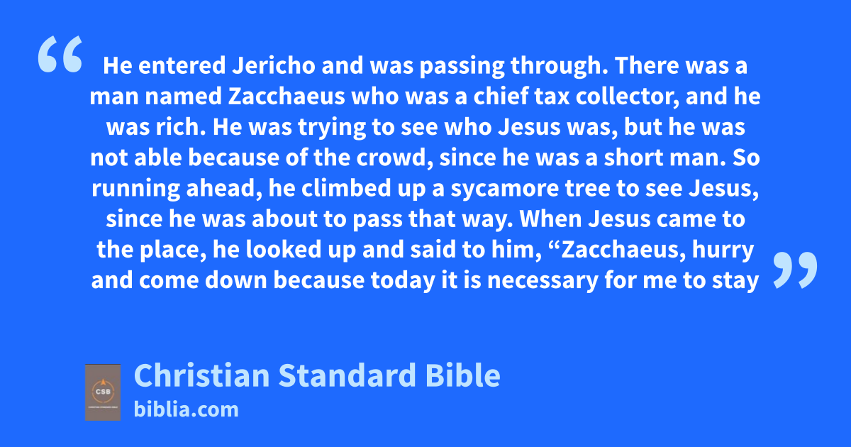 19 He entered Jericho and was passing through. 2 There was a man named Zacchaeus who was a chief tax collector, and he was rich. 3 He was trying to see who Jesus was, but he was not able because of the crowd, since he was a short man. 4 So running ahead, he climbed up a sycamore tree to see Jesus, since he was about to pass that way. 5 When Jesus came to the place, he looked up and said to him, “Zacchaeus, hurry and come down because today it is necessary for me to stay at your house.”