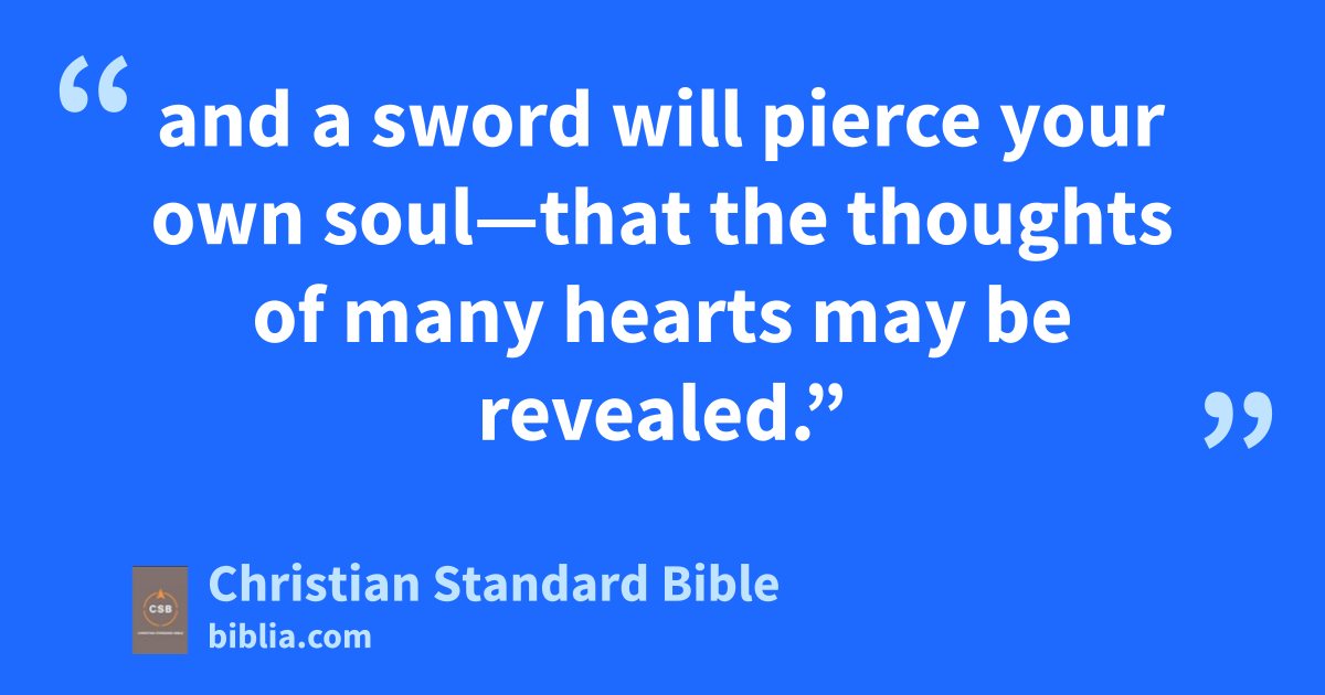 33 His father and motherE were amazed at what was being said about him. 34 Then Simeon blessed them and told his mother Mary, “Indeed, this child is destined to cause the fall and rise of many in Israelj and to be a sign that will be opposedF—35 and a sword will pierce your own soul—that the thoughtsG of many hearts may be revealed.”