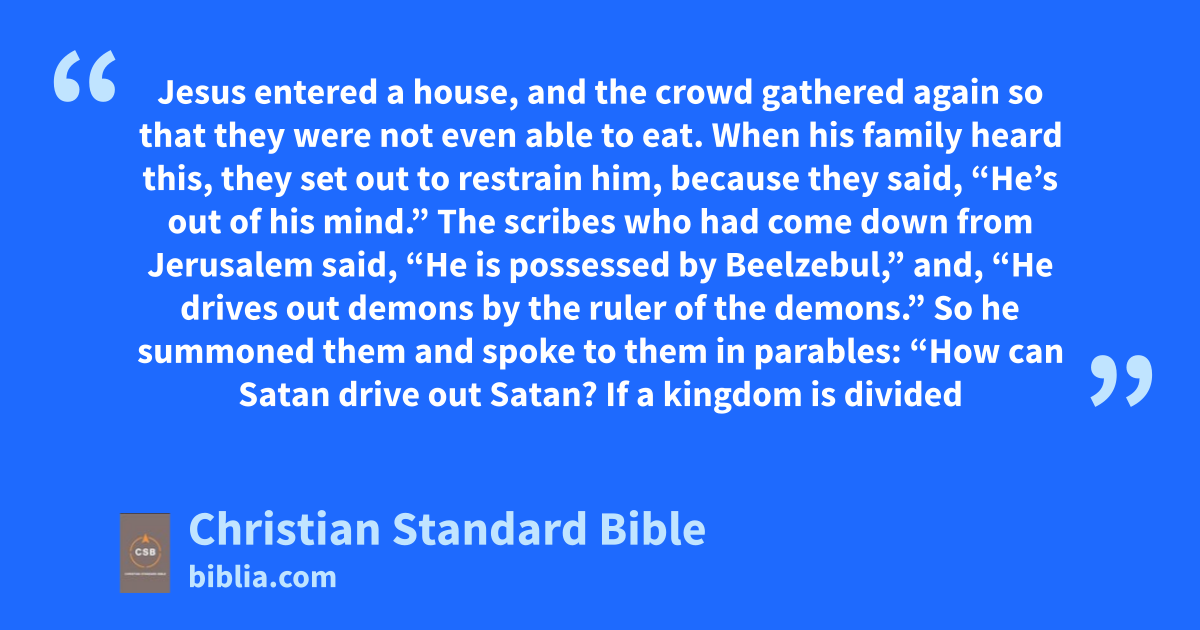23 So he summonedi them and spoke to them in parables:j “How can Satank drive out Satan?l 24 If a kingdomm is divided against itself, that kingdom cannot stand. 25 If a house is divided against itself, that house cannot stand. 26 And if Satan opposes himself and is divided, he cannot stand but is finished. 27 But no one can enter a strong man’s house and plunder his possessions unless he first ties upn the strong man. Then he can plunder his house.