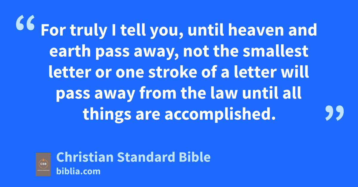 17 “Don’t think that I came to abolish the Law or the Prophets. I did not come to abolish but to fulfill.x 18 For truly I tell you, until heaven and earth pass away, not the smallest letterB or one stroke of a letter will pass away from the law until all things are accomplished. 19 Therefore, whoever breaks one of the least of these commands and teaches others to do the same will be called least in the kingdom of heaven. But whoever does and teaches these commands will be called great in the kingdom of heaven.y 20 For I tell you, unless your righteousness surpasses that of the scribes and Pharisees, you will never get into the kingdom of heaven.
