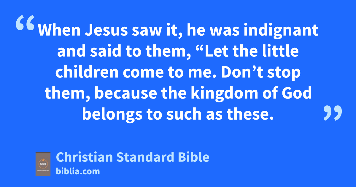 13 Peoplet were bringing little childrenu to him in order that he might touch them, but the disciples rebukedv them. 14 When Jesus saw it, he was indignantw and said to them, “Let the little children come to me.x Don’t stopy them, because the kingdom of Godz belongs to such as these. 15 Truly I tell you,aa whoever does not receiveA,ab the kingdom of God like a little childac will never enter it.” 16 After taking them in his arms, he laid his hands onad them and blessedae them.