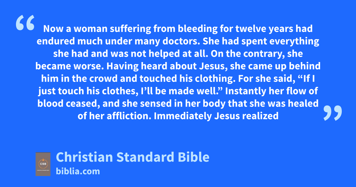25 Now a woman suffering from bleedingl for twelve years 26 had enduredm much under many doctors.n She had spent everything she had and was not helped at all. On the contrary, she became worse. 27 Having heard about Jesus, she came up behind him in the crowd and touchedo his clothing.p 28 For she said, “If I just touch his clothes, I’ll be made well.”q 29 Instantly her flow of blood ceased, and she sensed in her body that she was healedr of her affliction.