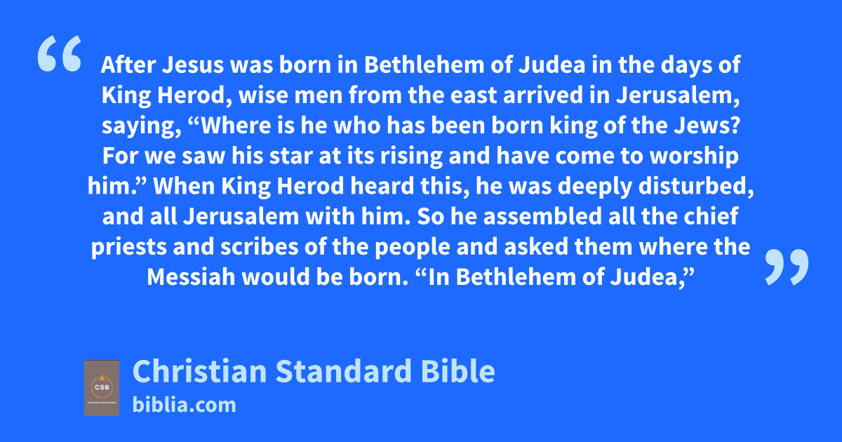 2 After Jesus was born in Bethlehem of Judea in the days of King Herod, wise men from the east arrived in Jerusalem,a 2 saying, “Where is he who has been born king of the Jews?b For we saw his star at its risingc and have come to worship him.”C
