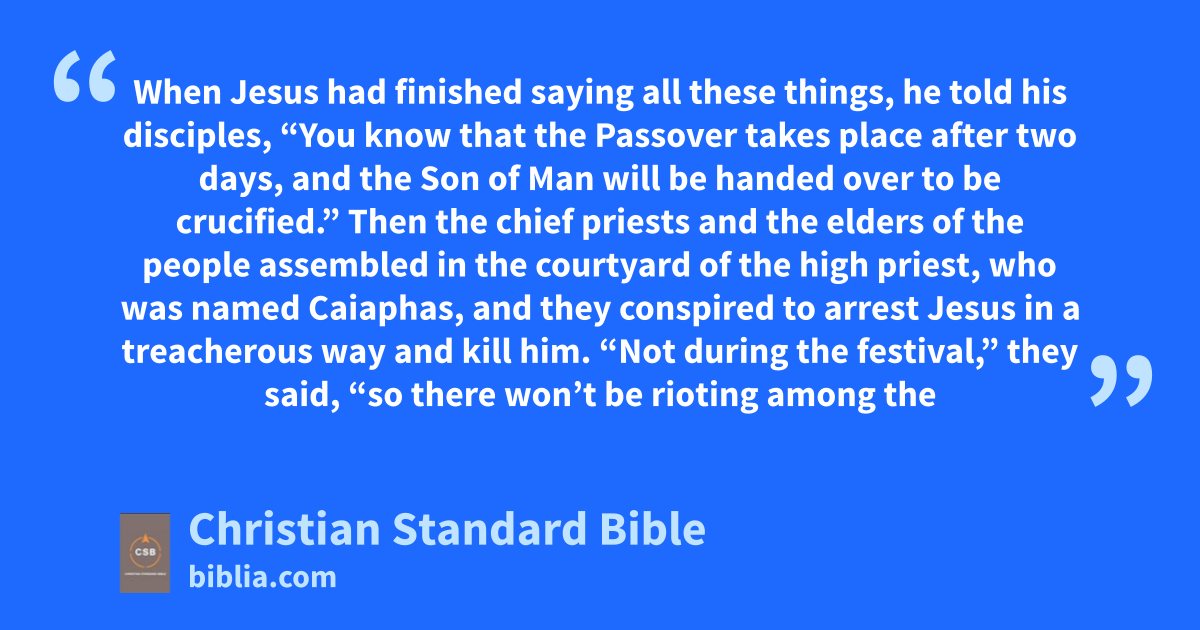 3 Then the chief priestsB and the elders of the people assembled in the courtyard of the high priest, who was named Caiaphas,e 4 and they conspired to arrest Jesus in a treacherous way and kill him.f 5 “Not during the festival,” they said, “so there won’t be rioting among the people.”