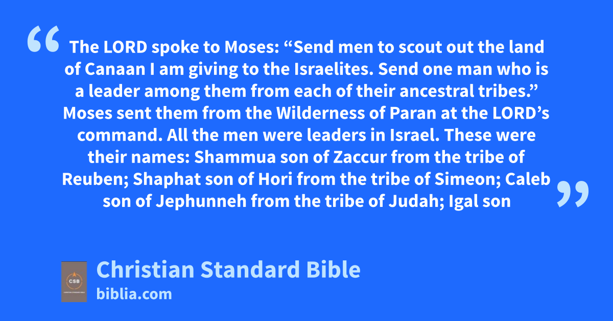 13 The Lord spoke to Moses: 2 “Send men to scout out the land of Canaank I am giving to the Israelites. Send one man who is a leader among them from each of their ancestral tribes.” 3 Moses sent them from the Wilderness of Paran at the Lord’s command. All the men were leaders in Israel.l 4 These were their names: