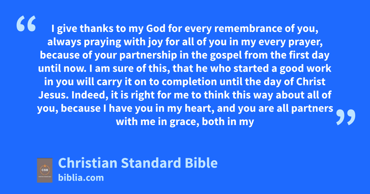 3 I give thanks to my God for every remembrance of you,A 4 always praying with joy for all of you in my every prayer, 5 because of your partnership in the gospel from the first dayf until now.g 6 I am sure of this, that he who started a good workh in youB will carry it on to completioni until the day of Christ Jesus. 7 Indeed, it is rightj for me to think this way about all of you, because I have you in my heart,C and you are all partners with me in grace, both in my imprisonmentk and in the defensel and confirmation of the gospel. 8 For God is my witness,m how deeply I miss all of youn with the affection of Christ Jesus. 9 And I pray this: that your loveo will keep on growingp in knowledge and every kind of discernment,q 10 so that you may approve the things that are superiorr and may be pures and blamelesst in the day of Christ,u 11 filled with the fruitv of righteousnessw that comes through Jesus Christ to the gloryx and praise of God.