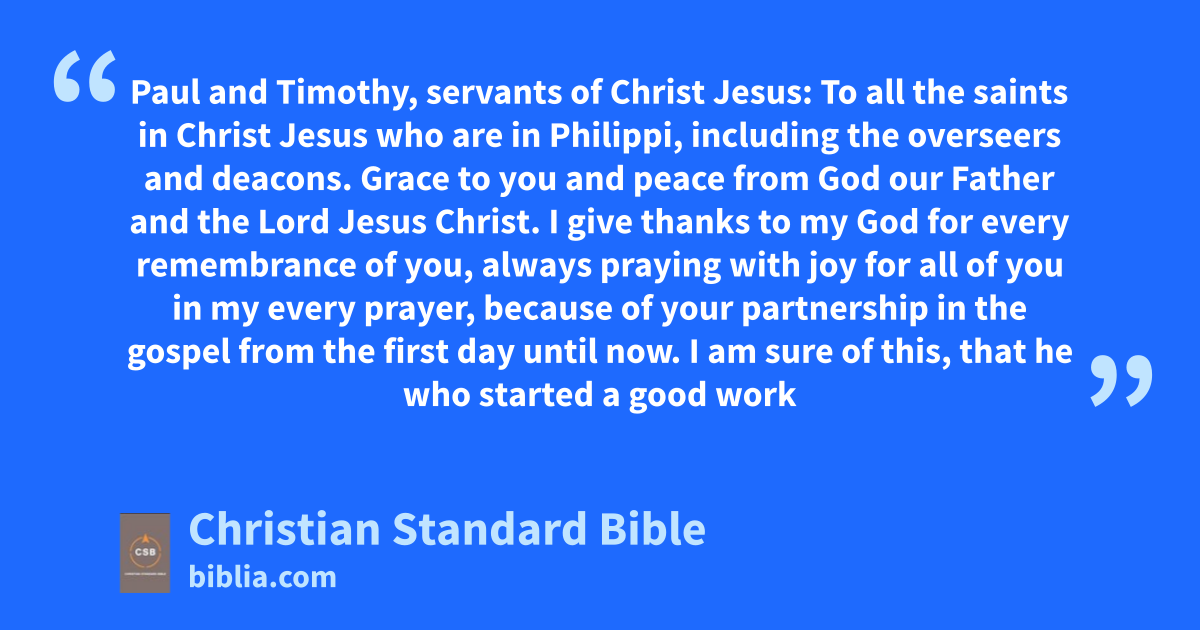 3 I give thanks to my God for every remembrance of you,A 4 always praying with joy for all of you in my every prayer, 5 because of your partnership in the gospel from the first dayf until now.g 6 I am sure of this, that he who started a good workh in youB will carry it on to completioni until the day of Christ Jesus. 7 Indeed, it is rightj for me to think this way about all of you, because I have you in my heart,C and you are all partners with me in grace, both in my imprisonmentk and in the defensel and confirmation of the gospel. 8 For God is my witness,m how deeply I miss all of youn with the affection of Christ Jesus. 9 And I pray this: that your loveo will keep on growingp in knowledge and every kind of discernment,q 10 so that you may approve the things that are superiorr and may be pures and blamelesst in the day of Christ,u 11 filled with the fruitv of righteousnessw that comes through Jesus Christ to the gloryx and praise of God.