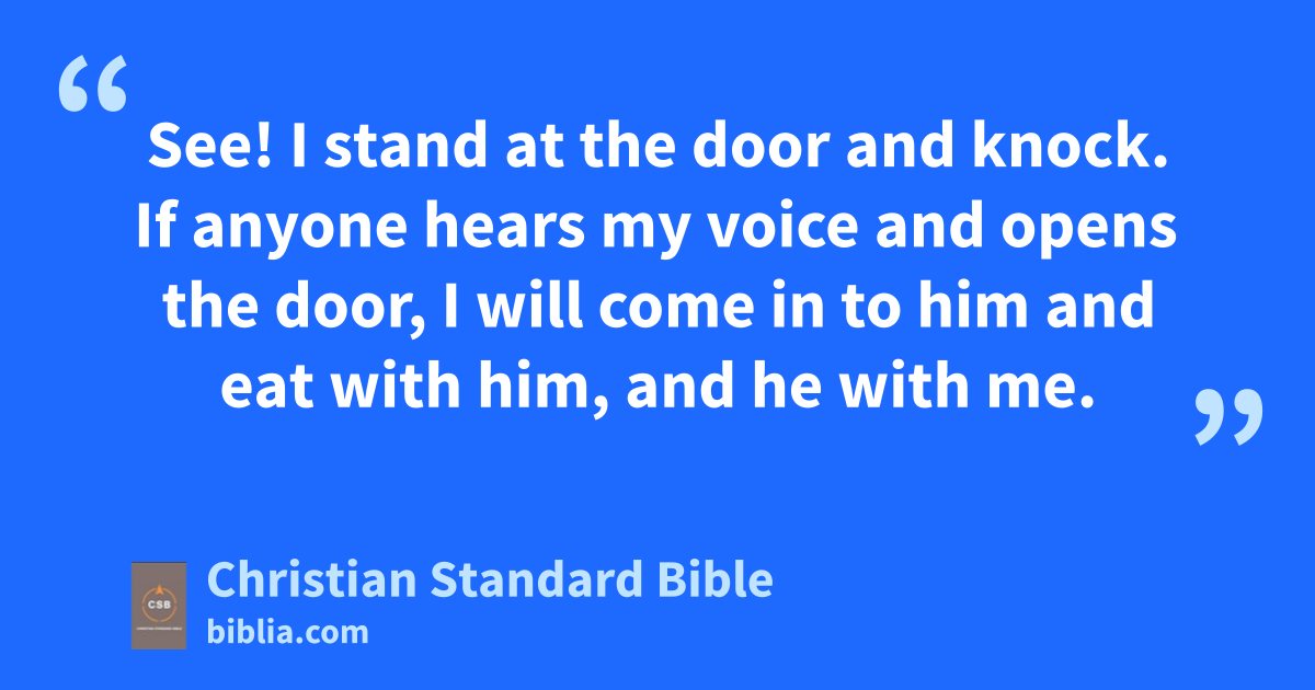 14 “Write to the angel of the church in Laodicea: Thus says the Amen,aa the faithful and true witness, the originatorB,ab of God’s creation: 15 I know your works, that you are neither cold nor hot. I wish that you were cold or hot. 16 So, because you are lukewarm, and neither hot nor cold, I am going to vomitC you out of my mouth. 17 For you say, ‘I’m rich; I have become wealthy and need nothing,’ac and you don’t realize that you are wretched, pitiful, poor, blind, and naked. 18 I advise you to buy from me gold refined in the fire so that you may be rich,ad white clothes so that you may be dressed and your shameful nakedness not be exposed,ae and ointment to spread on your eyes so that you may see. 19 As many as I love, I rebuke and discipline.af So be zealous and repent. 20 See! I stand at the door and knock. If anyone hears my voice and opens the door, I will come in to him and eat with him, and he with me.ag