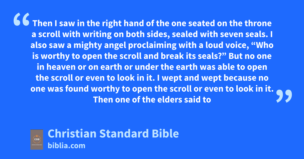 5 Then I saw in the right hand of the one seated on the throne a scroll with writing on both sides, sealed with seven seals.l 2 I also saw a mighty angelm proclaiming with a loud voice, “Who is worthy to open the scroll and break its seals?” 3 But no one in heaven or on earth or under the earth was able to open the scroll or even to look in it. 4 I wept and wept because no one was found worthy to openD the scroll or even to look in it. 5 Then one of the elders said to me, “Do not weep. Look, the Lion from the tribe of Judah,n the Root of David,o has conqueredp so that he is able to open the scroll andE its seven seals.”
