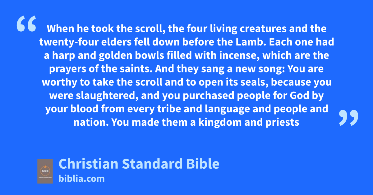 8 When he took the scroll, the four living creatures and the twenty-four elders fell down before the Lamb. Each one had a harps and golden bowlst filled with incense,u which are the prayers of the saints. 9 And they sang a new song:v