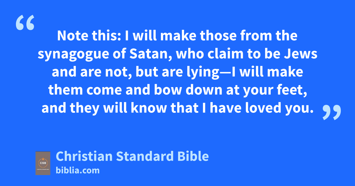 7 “Write to the angel of the church in Philadelphia: Thus says the Holy One, the true one,n the one who has the key of David, who opens and no one will close, and who closes and no one opens:o 8 I know your works. Look, I have placed before you an open door that no one can close because you have but little power; yet you have kept my word and have not denied my name.p 9 Note this: I will make those from the synagogue of Satan, who claim to be Jews and are not, but are lying—I will make them come and bow down at your feet,q and they will know that I have loved you.r 10 Because you have kept my command to endure, I will also keep you from the hour of testings that is going to come on the whole world to test those who live on the earth.t 11 I am coming soon.u Hold on to what you have,v so that no one takes your crown.w