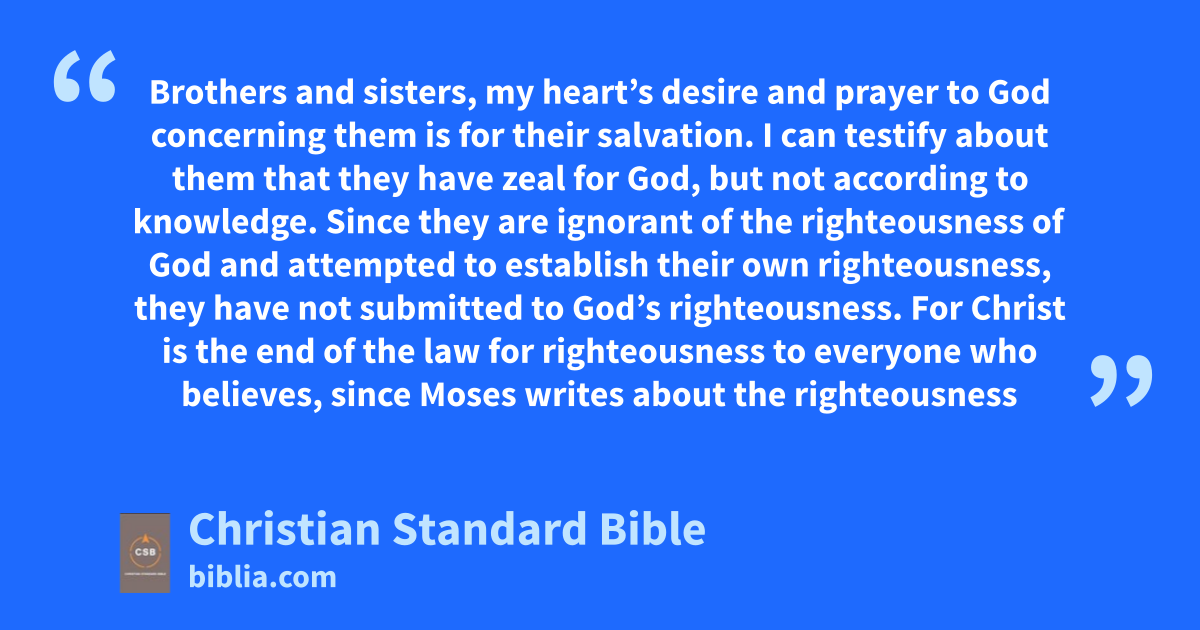 10 Brothers and sisters, my heart’s desire and prayer to God concerning themB is for their salvation. 2 I can testify about them that they have zeal for God,i but not according to knowledge. 3 Since they are ignorant of the righteousness of Godj and attempted to establish their own righteousness, they have not submitted to God’s righteousness. 4 For Christ is the endC of the law for righteousnessk to everyone who believes,l 5 since Moses writes about the righteousness that is from the law: The one who does these things will live by them.D,m 6 But the righteousness that comes from faithn speaks like this: Do not say in your heart, “Who will go up to heaven?”E,o that is, to bring Christ down 7 or, “Who will go down into the abyss?”F,p that is, to bring Christ up from the dead.q 8 On the contrary, what does it say? The message is near you, in your mouth and in your heart.G,r This is the message of faith that we proclaim: 9 If you confess with your mouth, “Jesus is Lord,”s and believe in your heartt that God raised him from the dead,u you will be saved. 10 One believes with the heart, resulting in righteousness, and one confesses with the mouth, resulting in salvation. 11 For the Scripture says, Everyone who believes on him will not be put to shame,H,v 12 since there is no distinction between Jew and Greek,w because the same Lordx of ally richly blesses all who call on him. 13 For everyone who calls on the name of the Lord will be saved.I,z