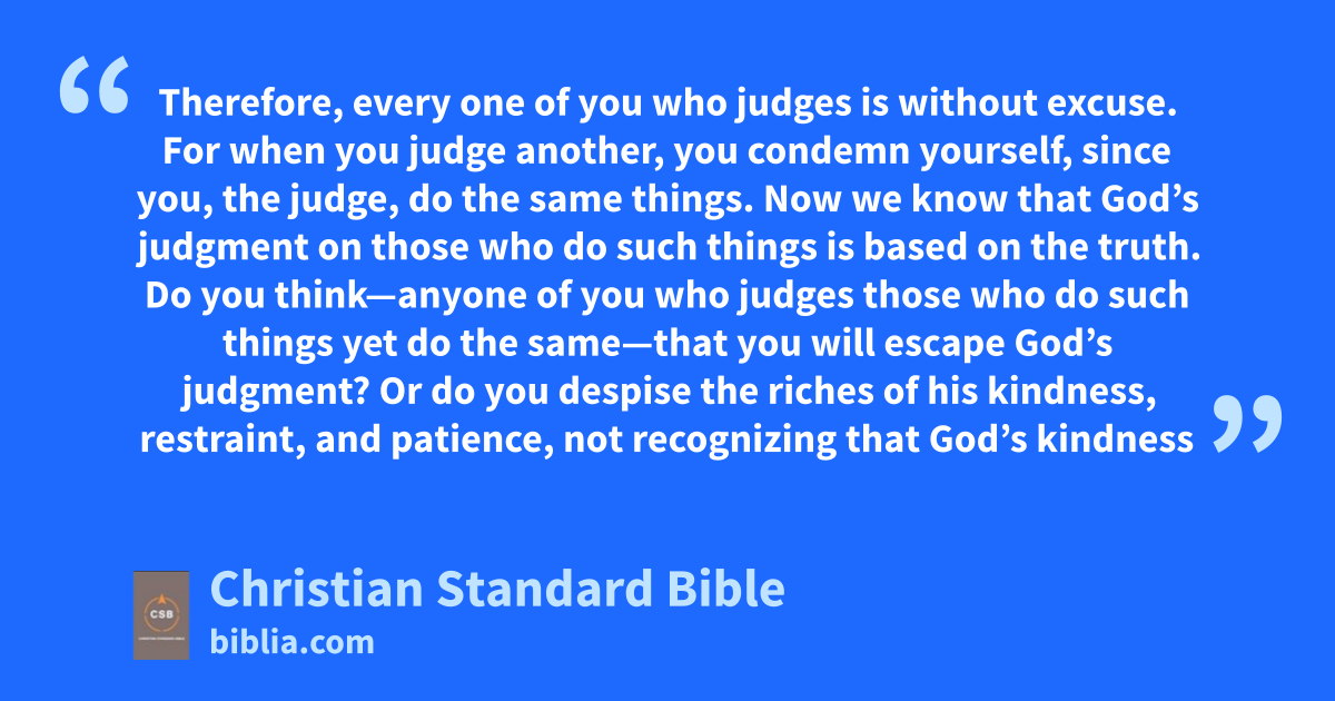 2 Therefore, every one of youI,g who judges is without excuse.h For when you judge another,i you condemn yourself, since you, the judge, do the same things. 2 Now we know that God’s judgment on those who do such things is based on the truth. 3 Do you think—anyone of you who judges those who do such things yet do the same—that you will escape God’s judgment? 4 Or do you despise the riches of his kindness,j restraint,k and patience,l not recognizingJ that God’s kindnessm is intended to lead you to repentance? 5 Because of your hardened and unrepentant heart you are storing up wrathn for yourself in the day of wrath,o when God’s righteous judgment is revealed. 6 He will repay each one according to his works:K,p 7 eternal lifeq to those who by persistence in doing goodr seek glory, honor,s and immortality;t 8 but wrath and anger to those who are self-seekingu and disobey the truthv while obeying unrighteousness. 9 There will be affliction and distressw for every human being who does evil, first to the Jew, and also to the Greek;x 10 but glory, honor, and peace for everyone who does what is good, first to the Jew, and also to the Greek. 11 For there is no favoritism with God.y