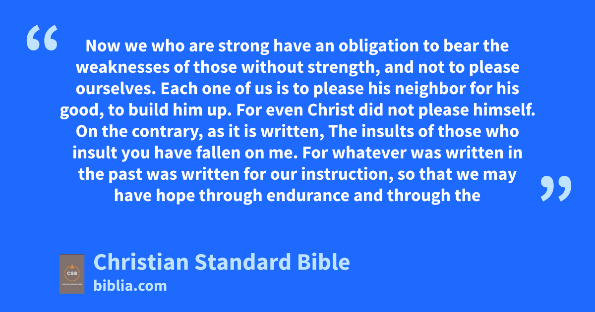 15 Now we who are strong have an obligation to bear the weaknesses of those without strength,al and not to please ourselves. 2 Each one of us is to please his neighbor for his good, to build him up.am 3 For even Christ did not please himself.an On the contrary, as it is written, The insults of those who insult you have fallen on me.C,ao 4 For whatever was written in the past was written for our instruction,ap so that we may have hope through endurance and through the encouragement from the Scriptures. 5 Now may the God who givesD endurance and encouragementaq grant you to live in harmony with one another,ar according to Christ Jesus, 6 so that you may glorify the God and Father of our Lord Jesus Christas with one mind and one voice.