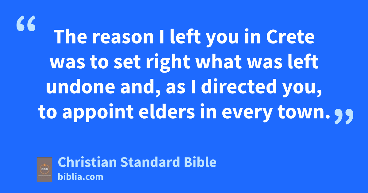 5 The reason I left you in Creteq was to set right what was left undone and, as I directed you, to appoint eldersr in every town. 6 An elders must be blameless,t the husband of one wife, with faithfulC children who are not accused of wildness or rebellion. 7 As an overseeru of God’s household, he must be blameless, not arrogant, not hot-tempered, not an excessive drinker, not a bully, not greedy for money, 8 but hospitable, loving what is good, sensible, righteous, holy, self-controlled, 9 holding to the faithful message as taught,v so that he will be able both to encourage with sound teachingw and to refute those who contradict it.
