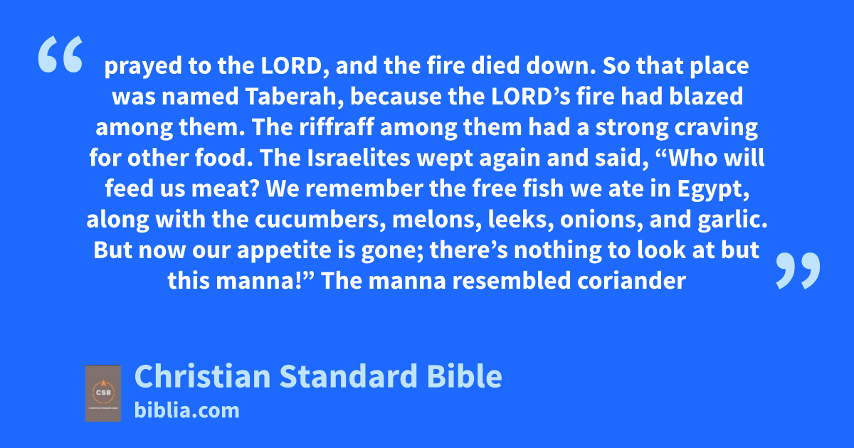 4 The riffraffA among themt had a strong cravingu for other food. The Israelites wept again and said, “Who will feed us meat? 5 We remember the free fish we ate in Egypt,v along with the cucumbers, melons, leeks, onions, and garlic. 6 But now our appetite is gone;B there’s nothing to look at but this manna!”