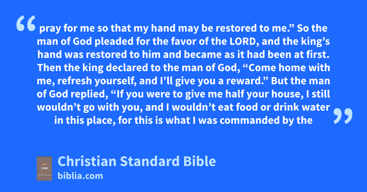 6 Then the king responded to the man of God, “Plead for the favor of the Lord your God and pray for mev so that my hand may be restored to me.” So the man of God pleaded for the favor of the Lord, and the king’s hand was restored to him and became as it had been at first.