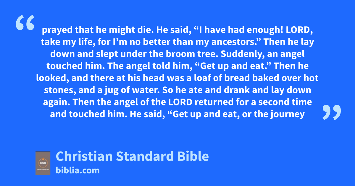 Suddenly, an angel touched him.af The angel told him, “Get up and eat.” 6 Then he looked, and there at his head was a loaf of bread baked over hot stones, and a jug of water.ag So he ate and drank and lay down again. 7 Then the angel of the Lordah returned for a second time and touched him. He said, “Get up and eat, or the journey will be too much for you.” 8 So he got up, ate, and drank. Then on the strength from that food, he walked forty days and forty nightsai to Horeb, the mountain of God.aj 9 He entered a caveak there and spent the night.