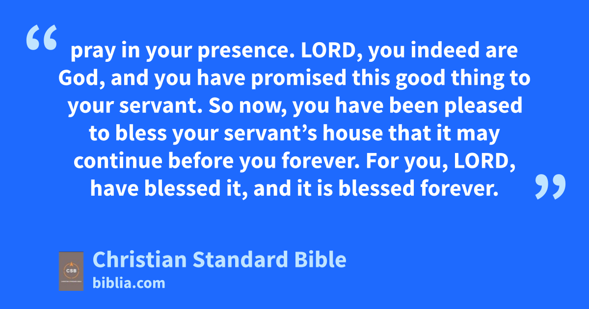 23 Now, Lord, let the word that you have spoken concerning your servant and his house be confirmed forever, and do as you have promised. 24 Let your name be confirmed and magnified forever in the saying, “The Lord of Armies, the God of Israel, is God over Israel.” May the house of your servant David be established before you. 25 Since you, my God, have revealed toC,x your servant that you will build him a house, your servant has found courage to pray in your presence. 26 Lord, you indeed are God, and you have promised this good thing to your servant. 27 So now, you have been pleased to bless your servant’s house that it may continue before you forever. For you, Lord, have blessed it, and it is blessed forever.