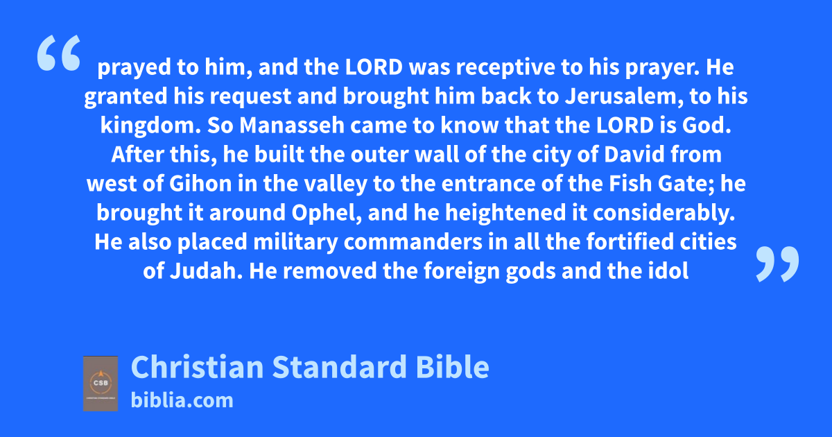 10 The Lord spoke to Manasseh and his people, but they didn’t listen.c 11 So he brought against them the military commanders of the king of Assyria. They captured Manasseh with hooks, bound him with bronze shackles, and took him to Babylon.d 12 When he was in distress, he sought the favor of the Lord his God and earnestly humbled himselfe before the God of his ancestors. 13 He prayed to him, and the Lord was receptive to his prayer. He granted his requestf and brought him back to Jerusalem, to his kingdom. So Manasseh came to know that the Lord is God.g
