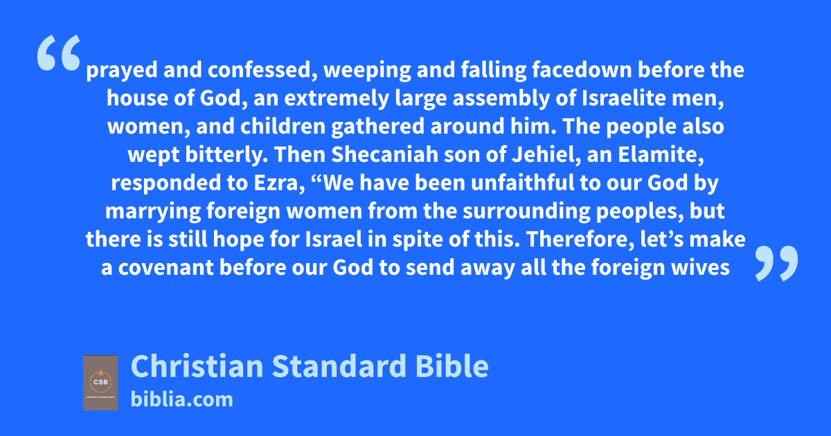 10 While Ezra prayed and confessed, weeping and falling facedownaa before the house of God, an extremely large assembly of Israelite men, women, and children gathered around him. The people also wept bitterly.ab 2 Then Shecaniah son of Jehiel,ac an Elamite, responded to Ezra, “We have been unfaithful to our God by marrying foreign women from the surrounding peoples,ad but there is still hope for Israel in spite of this. 3 Therefore, let’s make a covenant before our Godae to send away all the foreign wives and their children, according to the counsel of my lord and of those who tremble at the command of our God.af Let it be done according to the law. 4 Get up, for this matter is your responsibility,ag and we support you. Be strong and take action!”ah