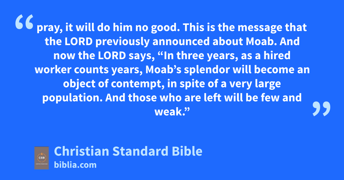 13 This is the message that the Lord previously announced about Moab. 14 And now the Lord says, “In three years, as a hired worker counts years,f Moab’s splendor will become an object of contempt, in spite of a very large population. And those who are left will be few and weak.”