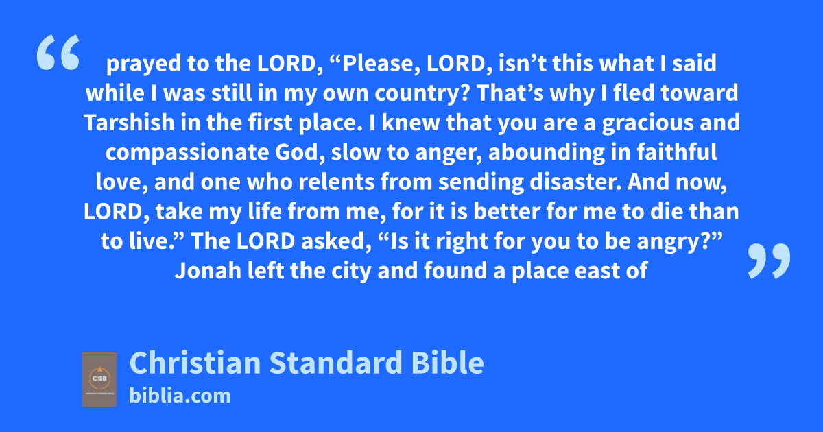 4 Jonah was greatly displeased and became furious.z 2 He prayed to the Lord,aa “Please, Lord, isn’t this what I said while I was still in my own country? That’s why I fled toward Tarshish in the first place.ab I knew that you are a gracious and compassionate God,ac slow to anger, abounding in faithful love, and one who relents from sending disaster.ad 3 And now, Lord, take my life from me,ae for it is better for me to die than to live.”af