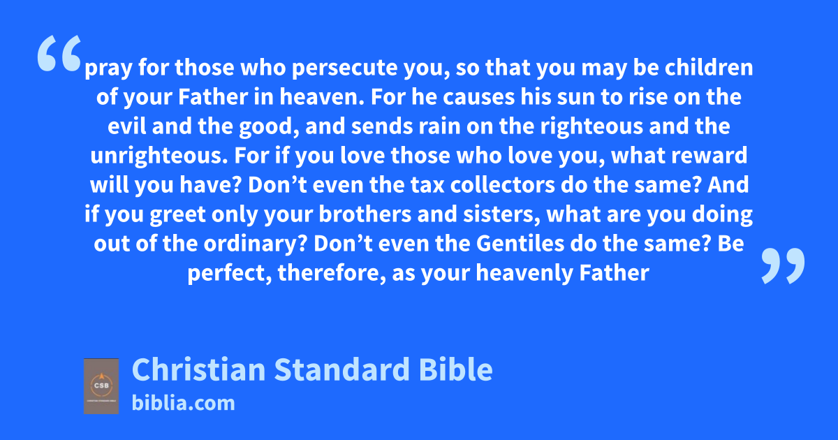 43 “You have heard that it was said, Love your neighborE,n and hate your enemy. 44 But I tell you, love your enemiesF and pray for those whoG persecute you,o 45 so that you may beH children of your Father in heaven. For he causes his sun to rise on the evil and the good, and sends rain on the righteous and the unrighteous.p 46 For if you love those who love you, what reward will you have? Don’t even the tax collectors do the same? 47 And if you greet only your brothers and sisters, what are you doing out of the ordinary?I,q Don’t even the GentilesJ do the same? 48 Be perfect,r therefore, as your heavenly Father is perfect.