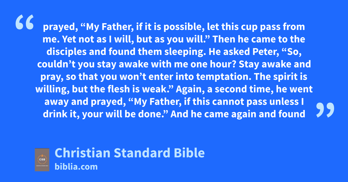 40 Then he came to the disciples and found them sleeping. He asked Peter, “So, couldn’t you stay awake with me one hour? 41 Stay awake and pray, so that you won’t enter into temptation. The spirit is willing, but the flesh is weak.”