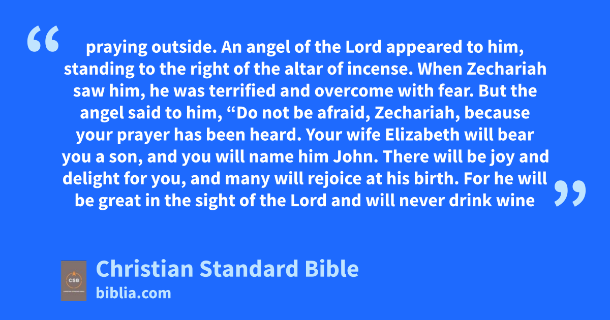 8 When his division was on dutyl and he was serving as priest before God, 9 it happened that he was chosen by lot,m according to the custom of the priesthood, to enter the sanctuary of the Lord and burn incense.n 10 At the hour of incense the whole assembly of the people was praying outside. 11 An angel of the Lordo appeared to him, standing to the right of the altar of incense.p 12 When Zechariah saw him, he was terrified and overcome with fear.q 13 But the angel said to him, “Do not be afraid,r Zechariah, because your prayer has been heard.s Your wife Elizabeth will bear you a son, and you will name him John.t 14 There will be joy and delight for you, and many will rejoice at his birth. 15 For he will be great in the sight of the Lord and will never drink wine or beer.u He will be filled with the Holy Spiritv while still in his mother’s womb.w 16 He will turn many of the children of Israel to the Lord their God.x 17 And he will go before him in the spirit and power of Elijah, to turn the hearts of fathers to their children,y and the disobedient to the understanding of the righteous, to make ready for the Lord a prepared people.”z