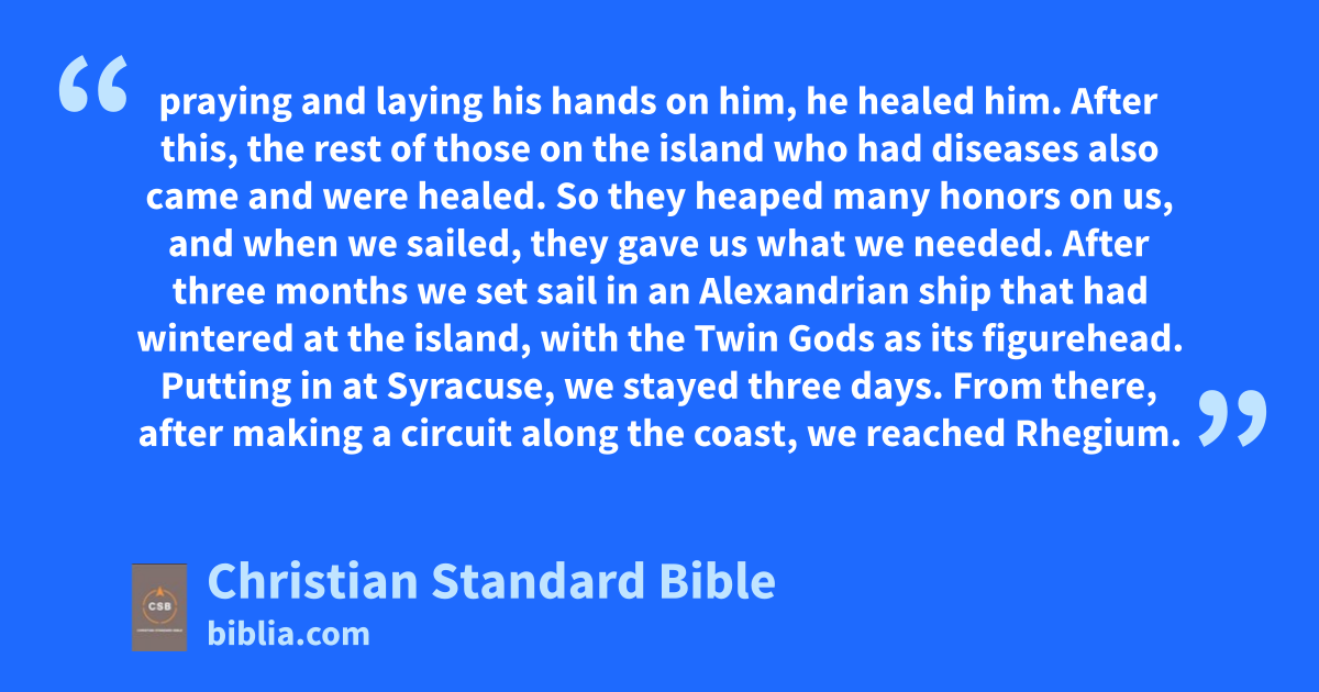 7 Now in the area around that place was an estate belonging to the leading man of the island, named Publius, who welcomed us and entertained us hospitably for three days. 8 Publius’s father was in bed suffering from fever and dysentery. Paul went to him, and praying and laying his hands on him, he healed him.l 9 After this, the rest of those on the island who had diseases also came and were healed. 10 So they heaped many honors on us, and when we sailed, they gave us what we needed.