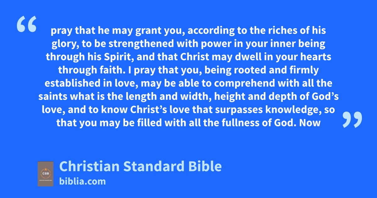 14 For this reason I kneelak before the FatherC 15 from whom every family in heaven and on earth is named. 16 I pray that he may grant you, according to the richesal of his glory,am to be strengthened with poweran in your inner beingao through his Spirit, 17 and that Christ may dwell in your hearts through faith. I pray that you, being rooted and firmly established in love, 18 may be able to comprehend with all the saints what is the length and width, height and depth of God’s love,ap 19 and to know Christ’s love that surpasses knowledge, so that you may be filled with all the fullness of God.