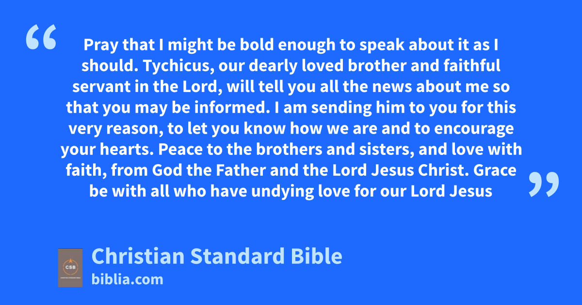 21 Tychicus,b our dearly loved brother and faithful servantD in the Lord, will tell you all the news about me so that you may be informed. 22 I am sending him to you for this very reason, to let you know how we are and to encouragec your hearts.d
