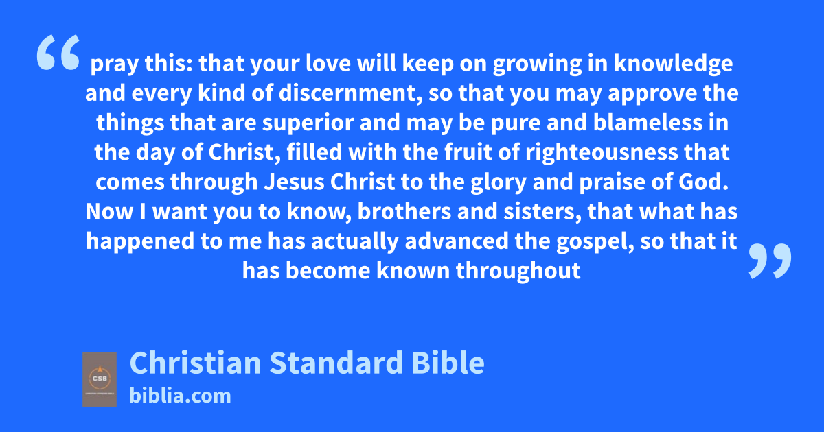 3 I give thanks to my God for every remembrance of you,A 4 always praying with joy for all of you in my every prayer, 5 because of your partnership in the gospel from the first dayf until now.g 6 I am sure of this, that he who started a good workh in youB will carry it on to completioni until the day of Christ Jesus. 7 Indeed, it is rightj for me to think this way about all of you, because I have you in my heart,C and you are all partners with me in grace, both in my imprisonmentk and in the defensel and confirmation of the gospel. 8 For God is my witness,m how deeply I miss all of youn with the affection of Christ Jesus. 9 And I pray this: that your loveo will keep on growingp in knowledge and every kind of discernment,q 10 so that you may approve the things that are superiorr and may be pures and blamelesst in the day of Christ,u 11 filled with the fruitv of righteousnessw that comes through Jesus Christ to the gloryx and praise of God.